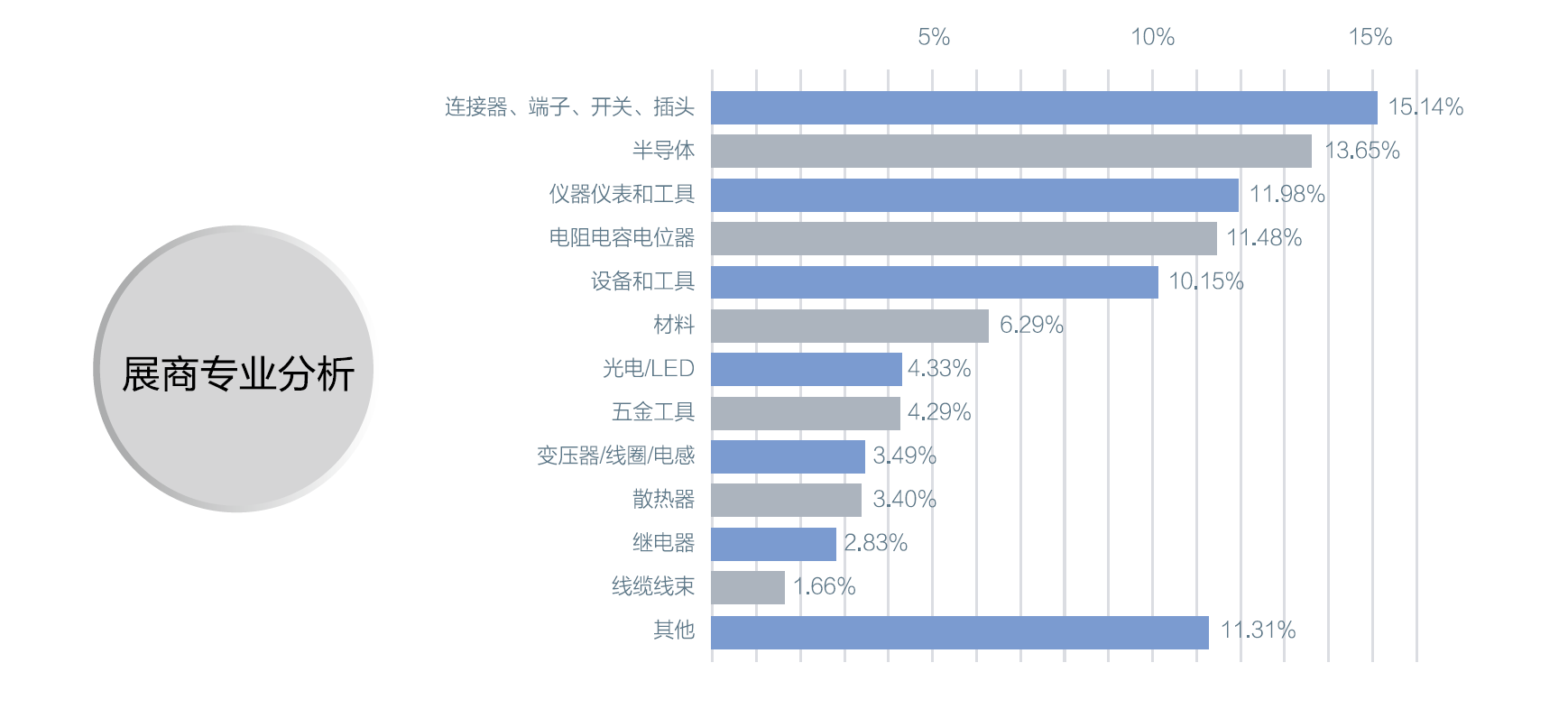 中國電子展始于1964年,自2012年,西部展永久落戶成都后,中國電子展確立了由深圳(春季展)、成都(夏季展)、上海(秋季展)輻射華南、西南和華東三大區(qū)域,基礎(chǔ)電子一直是中國電子展的創(chuàng)展基礎(chǔ),主要有:電阻/電容、變壓器/電感/線圈、電聲器件、連接器/端子/接插件/開關(guān)、繼電器、線纜線束、二極管/三極管/晶體管/晶閘管、傳感器/敏感元件、印刷電路版、電源/電池、微波/射頻器件、EMC器件及系統(tǒng)、諧振器/振蕩器/濾波器、功率器件等,在2012年以后,中國電子展主要展品除了綜合電子元器件和儀器設(shè)備外還增加了消費(fèi)類電子產(chǎn)品,在歷屆參展商中,半導(dǎo)體分立器件又占了很大比重,是中國電子展的重要展區(qū)。
