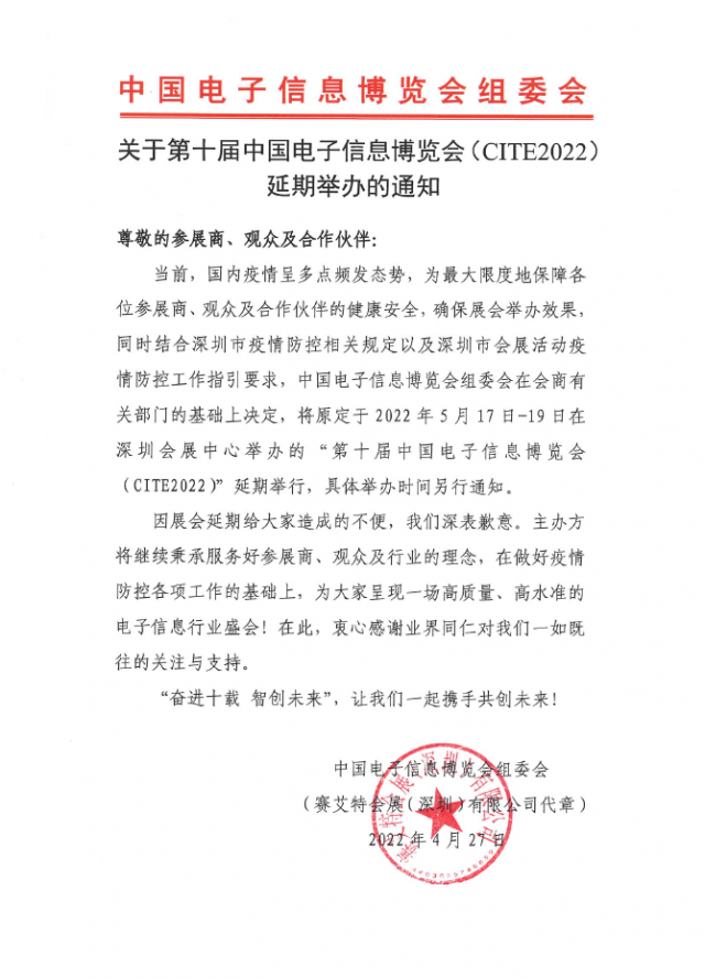 關(guān)于第十屆中國(guó)電子信息博覽會(huì)(CITE2022) 延期舉辦的通知