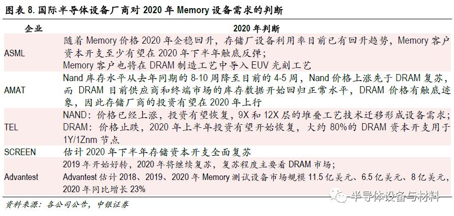 2020年全球半導體設備行業存在超預期可能,5G、云計算等支撐半導體設備市場再上新臺階。國際半導體設備廠商普遍預期Memory設備采購年內回暖。先進制程的技術節點遷移,全球半導體設備行業2019年下半年迎來全面復蘇,但存儲客戶所貢獻的設備需求占比仍在三、四季度延續下降趨勢。隨著Nand Flash價格持續上漲和DRAM價格由跌轉升,存儲廠商的設備需求也有望觸底回升,疊加邏輯客戶先進制程的進一步建產,隨著Memory價格2020年企穩回升,存儲廠設備利用率目前已有回升趨勢,Memory客戶資本開支至少有望在2020年下半年觸底反彈,Memory客戶也將在DRAM制造工藝中導入EUV光刻工藝。Nand庫存水平從去年同期的8-10周降至目前的4-5周,Nand價格上漲先于DRAM復蘇,而DRAM目前供應商和終端市場的庫存數據開始回歸正常水平,DRAM價格有觸底跡象,因此存儲廠商的投資有望在2020年上行。