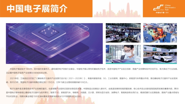 中國電子展起始于1964年,是中國歷史最悠久、最權威的電子信息行業展會。中國電子展以領先的基礎電子技術,促進中國電子產業自主創新;搭建產業供需和技術交流平臺,極大推動了行業發展,見證著中國電子信息產業發展壯大的成長的過程。