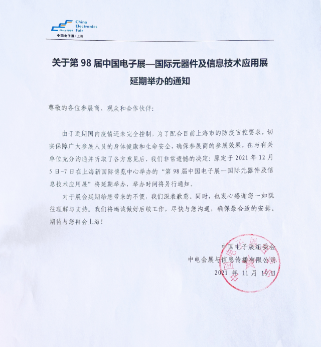 由于近期國內疫情還未完全控制,為了配合目前上海市的防疫防控要求,切實保障廣大參展人員的身體健康和生命安全,確保參展商的參展效果,在與有關單位充分溝通并聽取了各方意見后,我們非常遺憾的決定:原定于2021年12月5日-7日在上海新國際博覽中心舉辦的“第98屆中國電子展一國際元器件及信息技術應用展”將延期舉辦,舉辦時間將另行通知。對于展會延期給您帶來的不便,我們深表歉意。同時,也衷心感謝您一如既往理解與支持。我們將竭誠做好后續工作,盡快與您溝通,確保最合適的安排。期待與您再會上海!