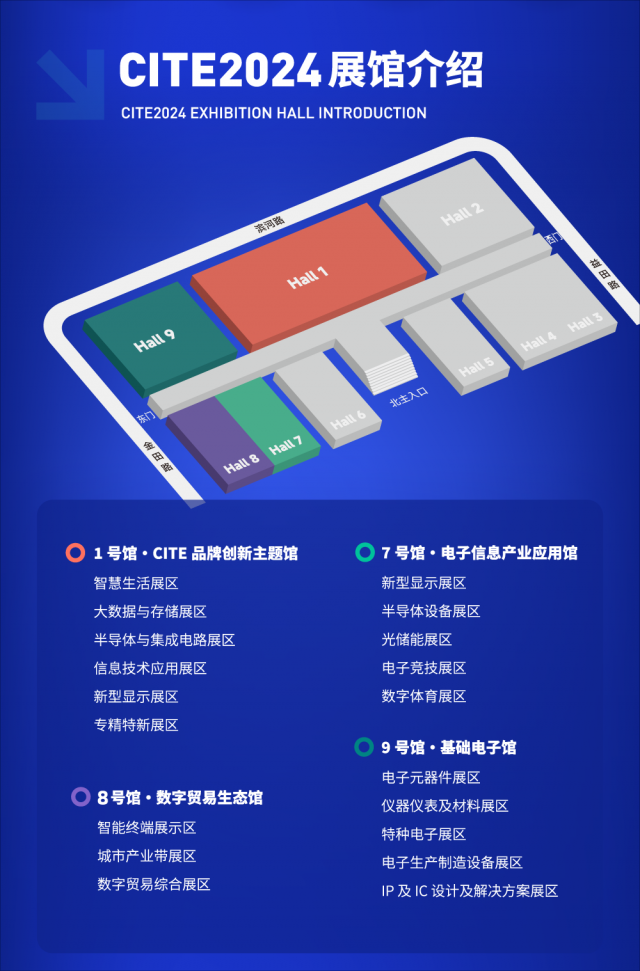 1號館:CITE品牌創新主題館:半導體產業鏈展區、智慧生活展區、信息技術應用展區、大數據與存儲展區、專精特新展區