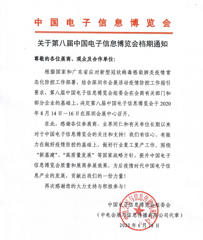 根據(jù)國家和廣東省應(yīng)對新型冠狀病毒感染肺炎疫情常態(tài)化防控工作部署,結(jié)合深圳市會展活動疫情防控工作指引要求,第八屆中國電子信息博覽會組委會在會商有關(guān)部門和部分企業(yè)的基礎(chǔ)上,決定第八屆中國電子信息博覽會于2020年8月14日-16日在深圳會展中心召開。在此,感謝各位參展商、業(yè)界同仁和有關(guān)單位長期以來對于中國電子信息博覽會的關(guān)注和支持!我們有信心、有能力在做好疫情防控的基礎(chǔ)上,做好行業(yè)復(fù)工復(fù)產(chǎn)工作。圍繞“新基建”、“高質(zhì)量發(fā)展”等國家戰(zhàn)略方針,提升中國電子信息博覽會質(zhì)量和展商參展效果,為后疫情時代中國電子信息產(chǎn)業(yè)的發(fā)展,貢獻(xiàn)出我們的一份力量!